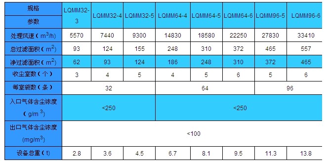 氣箱脈沖袋式除塵器LQMM型煤磨專用氣箱脈沖袋式除塵器技術(shù)參數(shù)表
