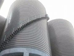螺旋式鋼板倉(cāng),它是由鋼板一層層對(duì)折鏈接起來的,其結(jié)構(gòu)決定了它鋼板必須薄,只適用于5000噸以下的小庫(kù)。其密封性好,可以存放存放水泥、粉煤灰、糧食等各種粉末狀物質(zhì)。它壁薄,壽命相比焊接倉(cāng)短。